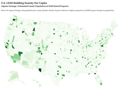 Data exploration and visualization of LEED (green building) rated projects in the U.S. since the formation of the U.S. Green Building Council. Projects are cross referenced against the U.S. Census Bureau's Disadvantaged Census Tract Data to explore the prevalence of sustainable design in disadvantaged communities (Staff pick from Observable team)